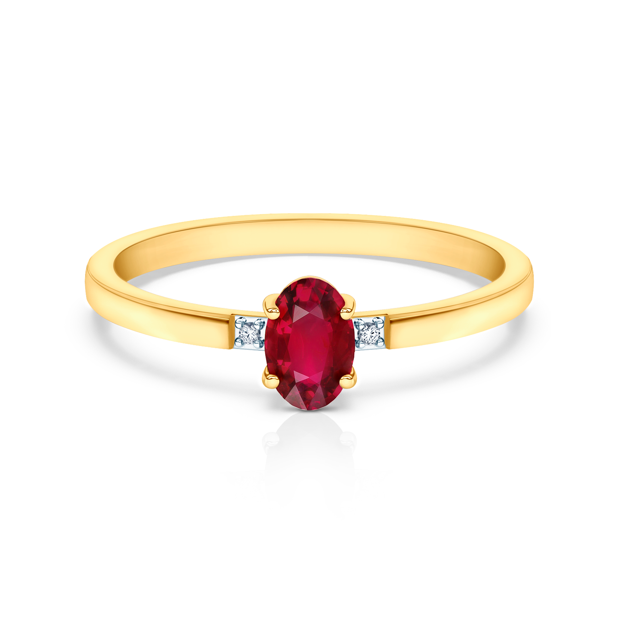 | Pierścionek zaręczynowy z owalnym rubinem 0,55ct, 2 diamentami o łącznej masie 0,01ct i parametrach SI2/H w szlifie brylantowym. Wykonany został z 14-karatowego dwukolorowego złota (próba 585). |