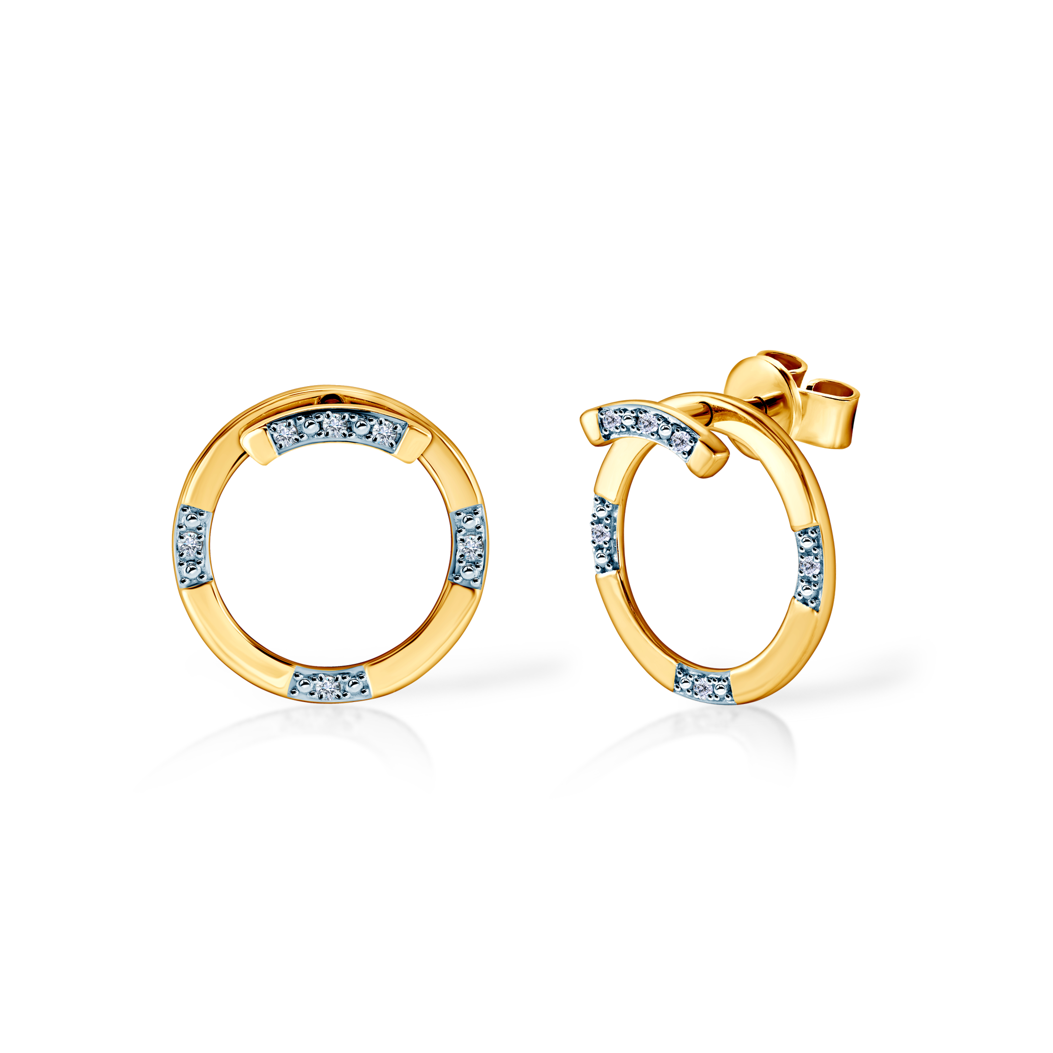 Kolczyki z 12 diamentami o łącznej masie 0,04 ct i szlifie brylantowym, wykonane z połączenia 14-karatowego białego i żółtego złota (próba 585).