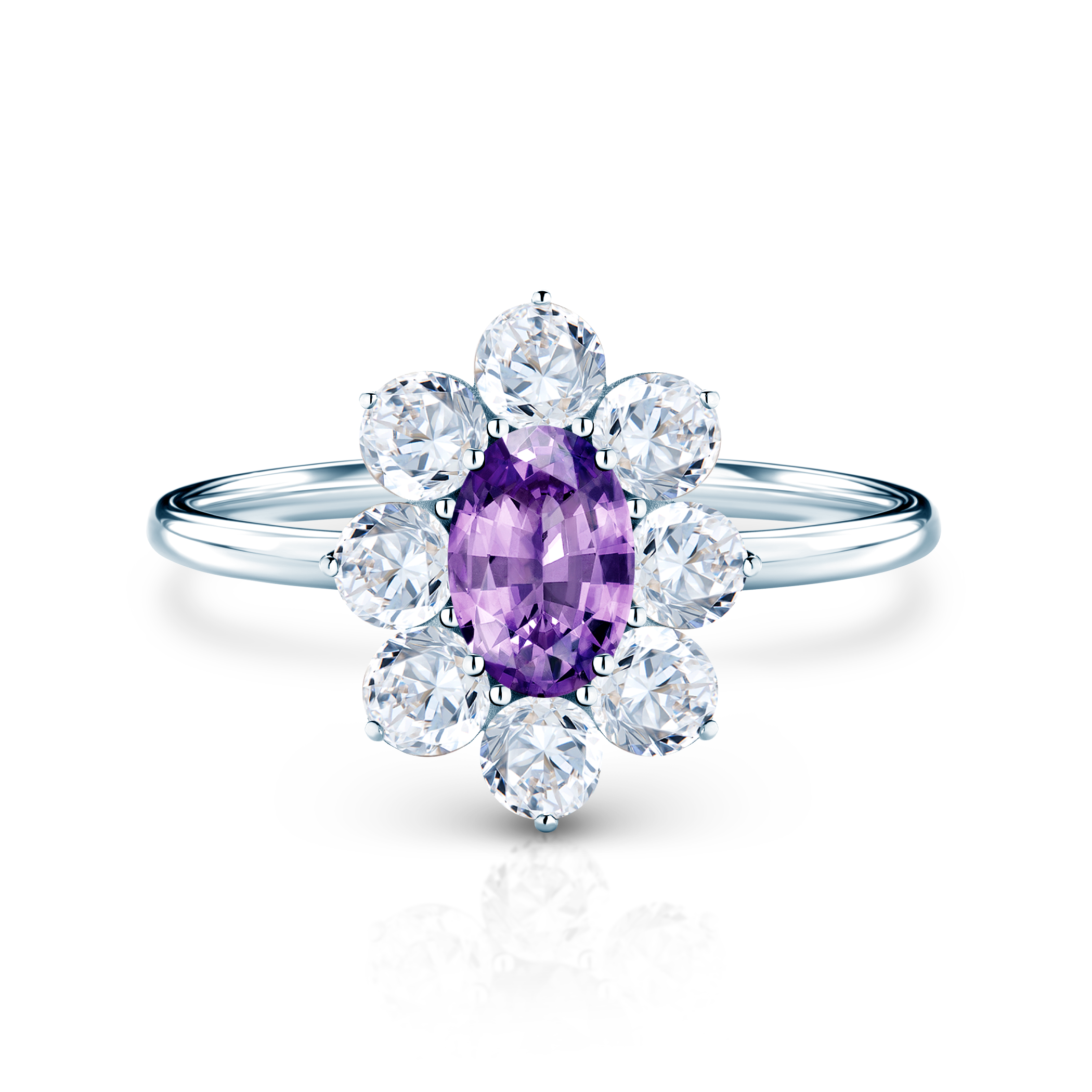 Pierścionek zaręczynowy z fioletowym szafirem o szlifie owalnym, masie 0,50 ct oraz 8 białymi szafirami o łącznej masie 0,8 ct, wykonany został z 14-karatowego białego złota próby 0,585.